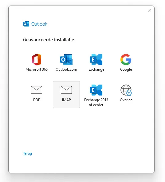 - Je krijgt nu opties voor geavanceerde installatie (indien nodig). Kies hier voor ‘IMAP’ als je e-mails wilt synchroniseren met de server. In dit voorbeeld gebruiken we ‘IMAP’ omdat dit de handigste manier is om e-mails op meerdere apparaten te gebruiken.